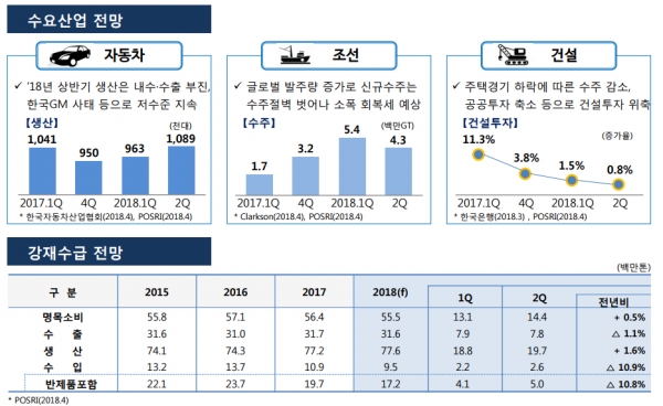 포스코에 따르면 2018년 상반기 자동차산업 생산은 내수·수출 부진, 한국GM 사태 등으로 저수준을 지속할 것으로 예상됐다. 1분기는 96만3,000대, 2분기는 108만9,000대 생산이 전망됐다.