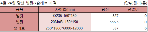 빌릿은 변동이 없었고 슬래브는 6달러 올랐다.