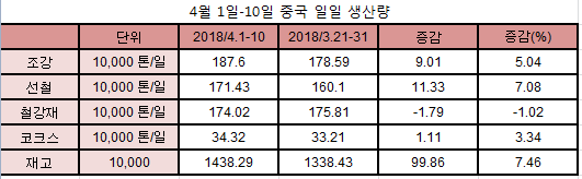 이를 토대로 산출한 4월 1일부터 10일까지 중국의 조강생산량은 2,411만2,700톤으로, 선철생산량은 1,931만4,600톤, 철강재 생산량은 2,781만5,000톤, 코크스 생산량은 1,195만8,300톤이었다.