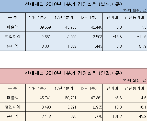 현대제철은 지난해에 이어 올 1분기에도 안정적인 매출 실적을 달성했다. 27일 열린 기업설명회를 통해 현대제철은 지난해 매출(단독기준)은 4조2,440억원을 보여 전년동기비 7.3% 증가했지만 영업이익은 2,502억원, 순이익은 1,443억원을 기록해 전년동기 보다 감소했다고 밝혔다.