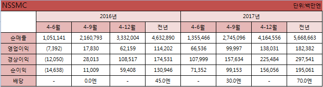NSSMC는 26일 2017년 실적 발표에서 미국의 법인세 인하로 순이익이 증가했다고 밝혔다. NSSMC에 따르면 지난해 순매출은 5조6,686억엔으로, 224% 증가했다. 이는 닛신제강(Nisshin Steel)을 자회사하면서 생긴 6,100억엔을 포함한 수치다.