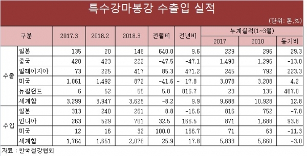 한국철강협회 수출입통계 자료에 따르면, 지난 3월 특수강마봉강 수출은 전년 동기 대비 9.9% 증가한 3,625톤을 기록했다.