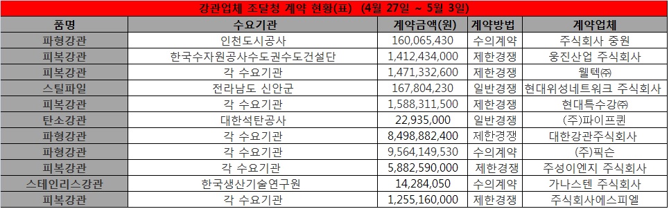 강관업체 조달청 계약 현황(표) (4월 27일 ~ 5월 3일)