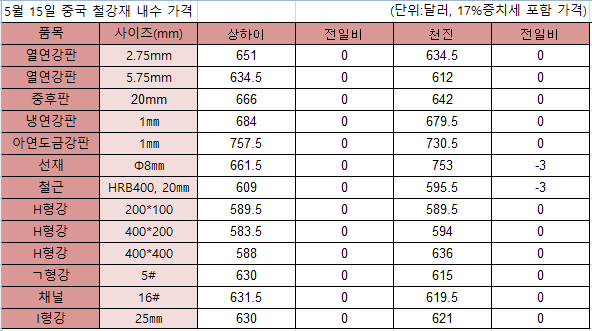 15일 중국 철강가격에는 큰 변동이 없었다. 천진에서 선재와 철근이 각각 3달러씩 하락한 것을 제외하면 모든 품목에서 움직임이 없었다.