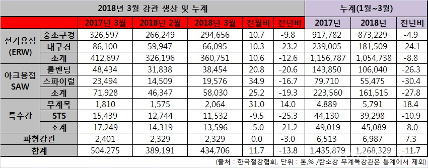 지난 3월 강관 생산은 총 43만4,706톤으로 지난 2017년 같은 기간 50만4,275톤에 비해 13.8% 감소한 것으로 나타났다.