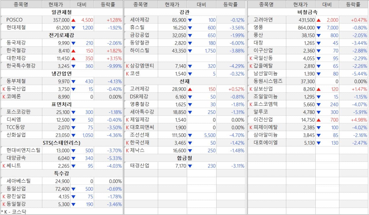 철강ㆍ비철금속 업체 주가 동향 (24일 종가 기준)