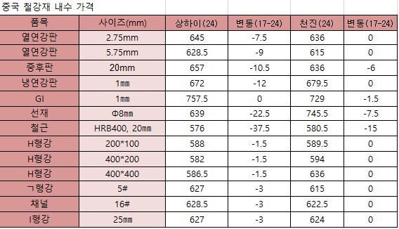 특히 건설용강재는 상승폭이 컸던만큼 하락폭도 크게 나타났다. 상하이의 선재와 철근 가격은 각각 22.5달러 37.5달러 등 큰폭으로 떨어졌다. 천진에서도 각각 7.5달러, 15달러 하락했다.