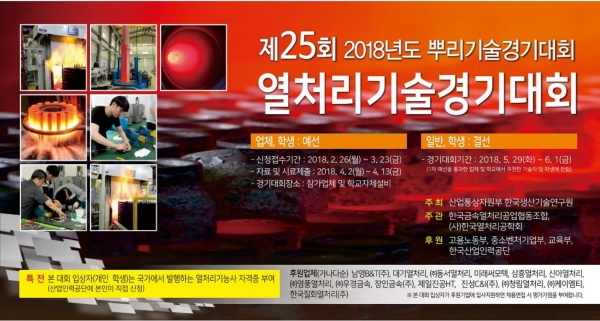 기계류 부품 및 소재의 품질향상, 열처리업계 종사자들의 긍지 및 사기 진작, 고급 열처리기술 인력 양성 및 안정적 확보 등을 위해 개최하는 ‘제25회 열처리기술경기대회’는 고용노동부, 중소벤처기업부, 교육부, 한국산업인력공단이 후원하며, 본 대회 입상자(개인, 학생)는 국가에서 발행하는 열처리기능사 자격증이 부여된다.