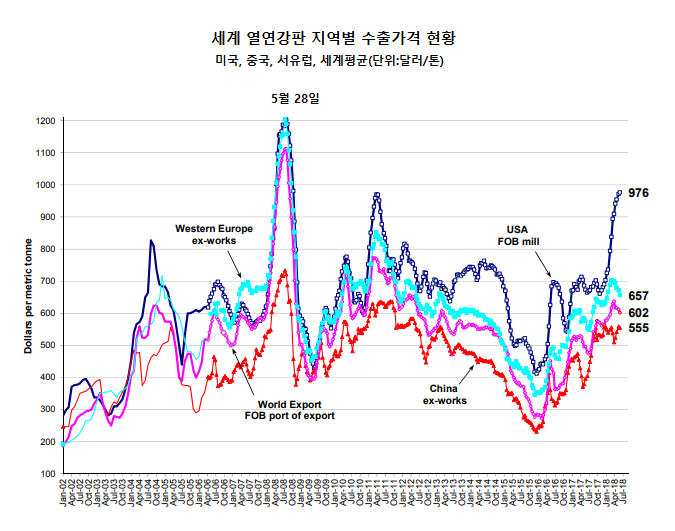 세계 HR 가격(FOB기준)은 2주전보다 10달러 하락한 602달러를 기록했다. 2016년 2월 272달러를 기록한 최저치보다 톤당 330달러 높은 수준이다.