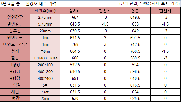 열연강판은 1.5달러에서 4.5달러까지 하락했고, 중후판은 3달러 하락했다. 건설용강재는 천진에서 하락했다. 선재는 1.5달러, 철근은 3달러 떨어졌다.