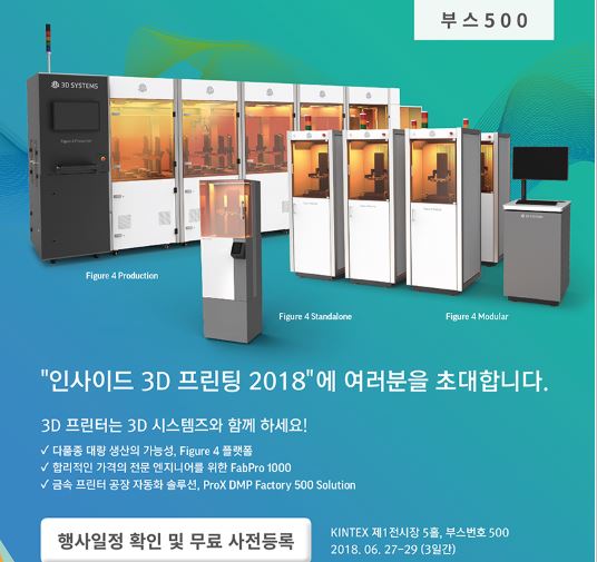 전 세계 3D프린터업계를 선도하는 3D시스템즈의 한국지사인 3D시스템즈코리아가 6월 27일부터 29일까지 일산 킨텍스에서 개최하는 ‘인사이드 3D프린팅 2018’에 참가한다.