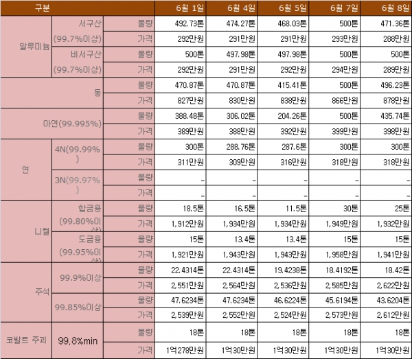 6월 8일 조달청 비철금속 비축물자 방출가격