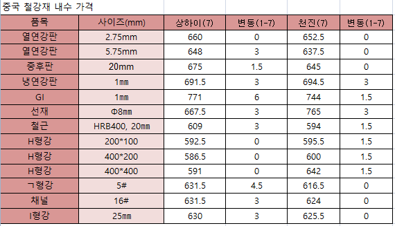 냉연강판 역시 상하이와 천진에서 모두 3달러 상승했다. 건설용강재도 소폭 상승했다. 선재는 상하이와 천진에서 모두 3달러 올랐고 철근은 상하이에서 3달러, 천진에서 1.5달러 상승했다. 형강류도 품목별로 상승했다.