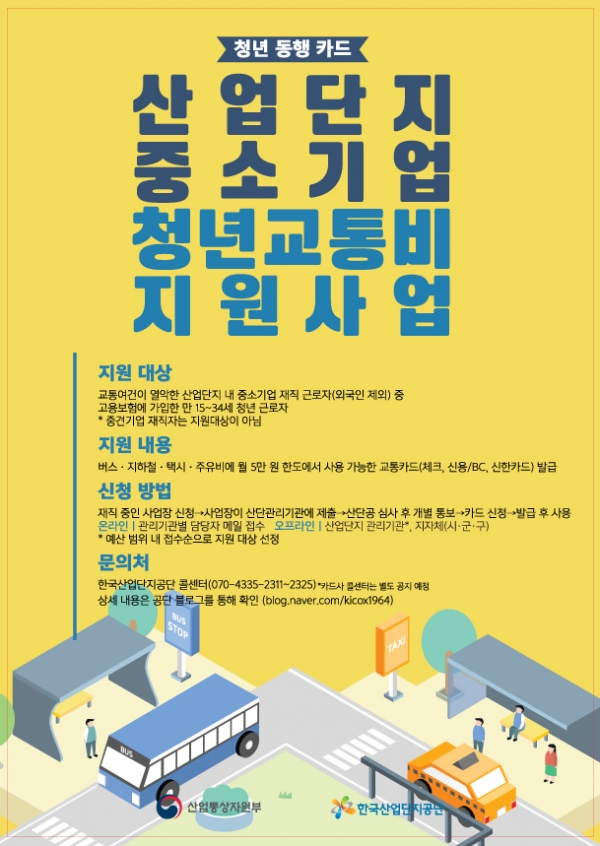 산업통상자원부(장관 백운규, 이하 산업부)와 한국산업단지공단(이사장 황규연, 이하 산단공)은 산업단지 중소기업 청년 교통비 지원사업(이하 청년동행카드)의 신청·접수를 오는 15일부터 시작한다.