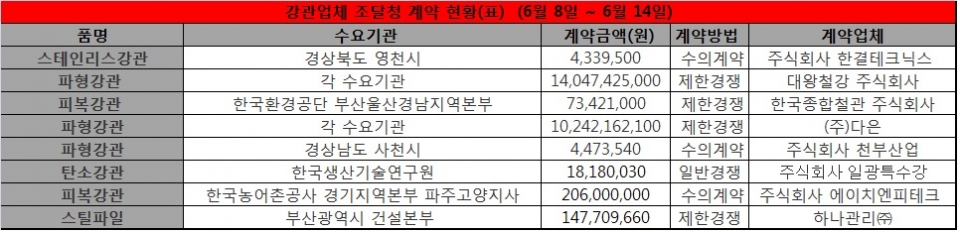 강관업체 조달청 계약 현황(표) (6월 8일 ~ 6월 14일)