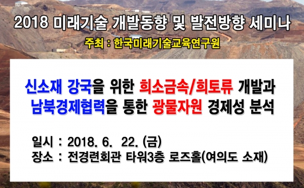 이런 상황에 맞춰 한국미래기술교육연구원(http://www.kecft.or.kr, 대표 박희정)은 오는 22일 오전 10시부터 오후 5시까지 서울 여의도 전경련회관 타워3층 로즈홀에서 ‘신소재 강국을 위한 희소금속 및 희토류 개발과 남북경제협력을 통한 광물자원의 경제성 분석 세미나’를 개최한다고 밝혔다.