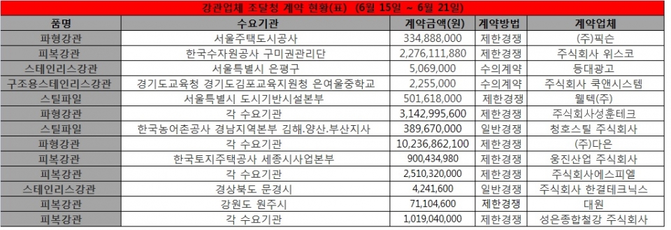 강관업체 조달청 계약 현황(표) (6월 15일 ~ 6월 21일)