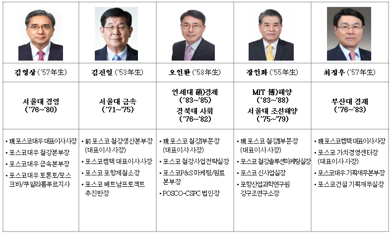오늘 이사회에서 확정된 후보군은 김영상 포스코대우 대표이사 사장, 김진일 前 포스코 대표이사 사장, 오인환 포스코 대표이사 사장, 장인화 포스코 대표이사 사장, 최정우 포스코켐텍 대표이사 사장(가나다順)이다.