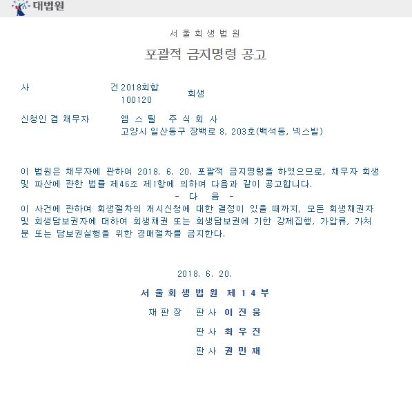 충남 당진 소재 강관 제조업체 엠스틸(대표 박종명)이 경기침체로 인한 매출 감소에 법정관리를 신청했다. 서울회생법원은 지난 6월 20일 엠스틸에 포괄적 금지명령을 내리고 이를 공고 했다.