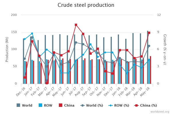 5월 세계 조강생산량이 증가했다. 세계철강협회가 25일(현지시간) 공개한 2018년 5월 세계 64개국 조강생산량 통계에 따르면 5월 글로벌 철강업계는 총 1억5,490만톤을 생산했다. 전년 동월 대비 6.6% 늘어난 수치다.