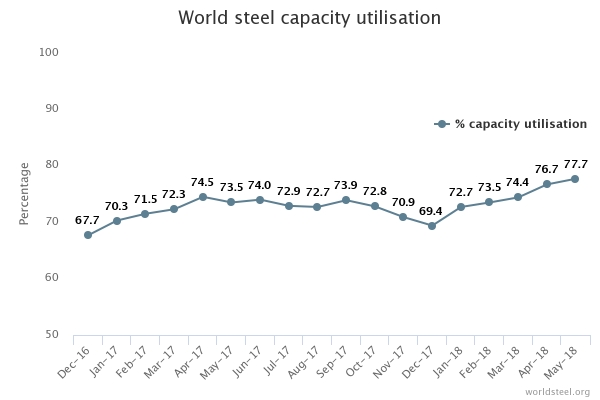64개국의 설비 가동률 평균은 77.7%로 계산됐다. 지난해 5월과 비교해 4.2% 높았다. 전월인 4월과 비교해서도 1% 높았다.