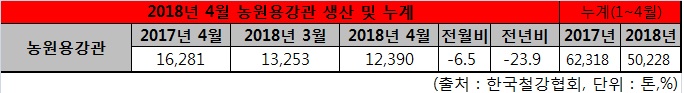 지난 4월 농원용강관 생산은 총 1만2,390톤으로 지난해 같은 기간 1만6,281톤 보다 23.9% 감소했다.