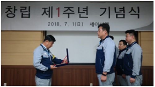 세아씨엠(대표 김동규)이 지난 1일 창립 1주년을 맞아 본사인 군산공장과 영업부분이 있는 서울사무소에서 전 임직원이 참석한 가운데 창립 1주년 기념식을 개최했다.