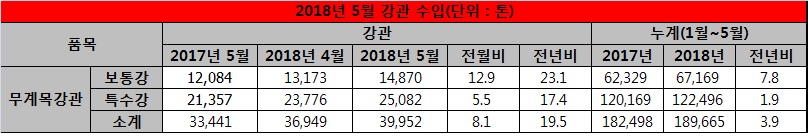 강관 업계 한 관계자는 “중국산 저가 제품을 비롯해 일본산 제품의 국내 유통판매 증가로 국산 제품 판매에 큰 어려움을 겪고 있다”며 “전방산업의 수요가 침체되어 있는 상황에서 수입재로 인해 골머리를 앓고 있는 상황”이라고 전했다.