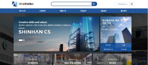 신규 홈페이지는 회사소개부터, 제품정보, 설비사양까지 한눈에 살펴볼 수 있다. 신한씨에스는 지난 2006년 설립된 종합건설업체 신한산업개발과 2008년 설립된 철강기업 신한에스엔지를 모기업으로 두고 있으며 2017년 3월 데크플레이트 제조 전문기업으로 설립됐다.