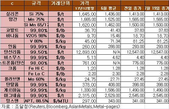 7월 19일 희유금속 가격동향 표
