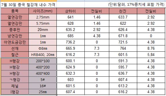 오늘 상하이에서는 열연강판 2.75mm, 5.75mm 가격이 1.46달러씩 상승했으며, 중후판 2.92달러, 냉연강판은 4.38달러, 선재와 철근이 각각 7.92달러 상승했다. 천진에서는 열연강판 2.75mm, 5.75mm 가격이 1.46달러씩 상승했으며, 중후판과 아연도금강판이 2.92달러씩 상승했다. 선재는 8.76달러, 철근은 5.84달러 상승했으며, H형강200mm*100mm, 400mm*200mm, 400mm*400mm, ㄱ형강, 채널, I형강은 각각 4.38달러씩 상승했다.