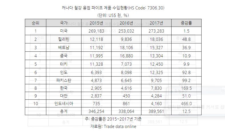 캐나다는 용접파이프 수입시장은 2017년 원자재시장 회복세에 힘입어 공공 및 민간 인프라 건설 투자가 늘면서 전년 대비 15.2%의 높은 증가율을 기록했다. 이번에 반덤핑 조사 대상으로 지목된 4개국은 지난 3년간 40~100%대의 높은 성장률을 이어오고 있다.