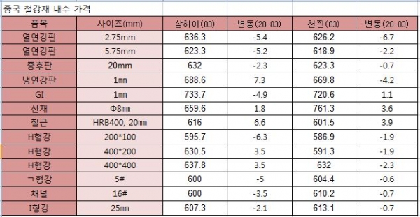 이와 같은 위안화 약세로 인해 중국의 철강재 내수시장은 위안화 표시 가격의 상승세에도 불구하고, 상하이에서는 냉연강판, 선재, 철근, H형강 일부 품목, 천진에서는 아연용융도금강판, 선재, 철근을 제외한 전 품목의 달러 표시 가격이 하락했다.