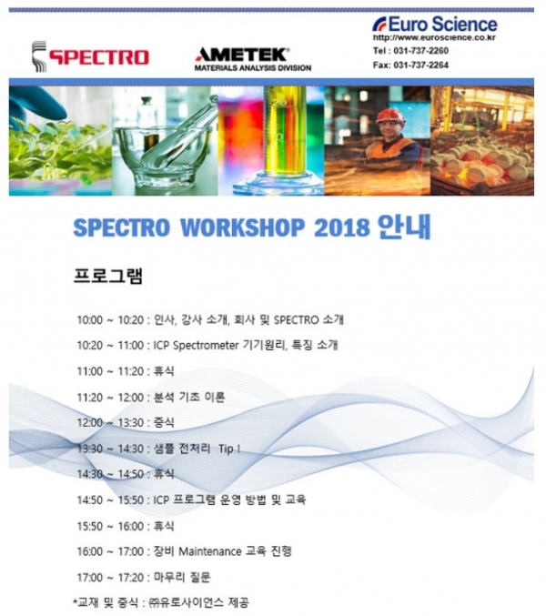 유로사이언스(대표 김문일)는 오는 30일 오전 10시부터 오후 5시까지 경기도 성남에 위치한 본사에서 ‘SPECTRO 2018년 정기 워크숍’을 개최한다.