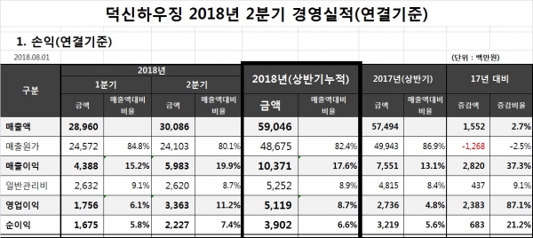 2018년 상반기 매출액 590억원, 영업이익 51억원, 당기순이익 39억원