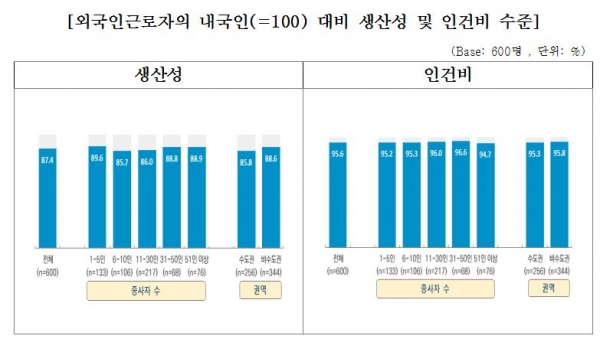 조사에 따르면 외국인근로자의 노동생산성은 내국인 대비 87.4%이나 1인당 월평균 급여는 내국인의 95.6% 수준으로 지급하고 있어 기업들이 외국인근로자의 생산성에 비해 과도한 임금을 부담하고 있는 것으로 나타나 이와 같은 결과를 뒷받침하고 있다.