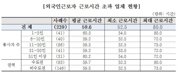 또한, 외국인근로자를 활용하는 기업 중 근로시간이 52시간을 초과하는 업체의 평균 주당 외국인근로자 근로시간은 59.6시간으로 근로시간 단축을 적용하기 위해서는 7.6시간을 단축시켜야 하므로 12.8%의 외국인력 부족률이 발생하여 인력 확보에도 부담이 되는 것으로 조사되었다.