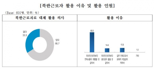 외국인근로자 활용업체 10개 중 7개(66.7%), “북한근로자 활용 원한다”