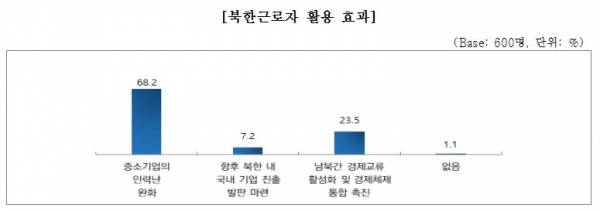 또한, 활용의사가 “있다”라고 응답한 업체의 70% 가까이가 북한근로자를 활용함으로써 중소기업의 인력난을 완화시키는 효과가 있다고 하여 북한근로자 수요에 대한 기대가 높은 것으로 나타났다.