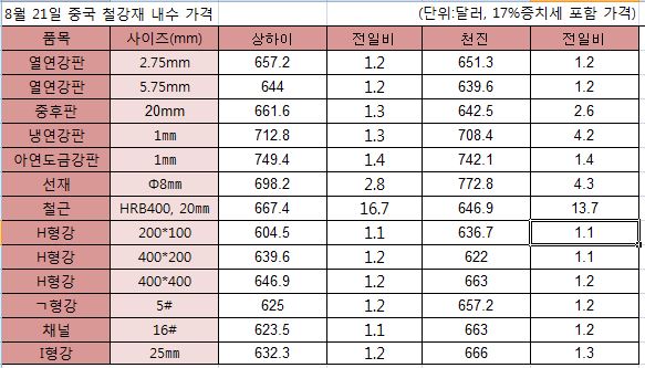 이번 주 들어 큰 폭으로 상승한 중국의 내수 철강재 가격이 상승세를 지속하고 있다. 위안화 표시 가격이 상승한 품목은 많지 않으나 하락한 품목은 없었으며, 환율 상승으로 인해 달러 표시 가격도 모두 상승했다.