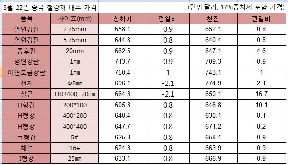 천진에서는 열연강판 2.75mm와 5.75mm가 0.8달러씩 상승했으며, 중후판은 4.6달러 냉연강판은 0.9달러, 아연도금강판은 1달러, 선재는 2.1달러 상승했다. 철근은 16.7달러 상승하했고, H형강 200mm*100mm, 400mm*200mm, 400mm*400mm은 각각 10.1달러, 8.1달러, 8.2달러씩 상승했으며, ㄱ형강과 채널, I형강과 채널은 0.9달러씩 상승했다.
