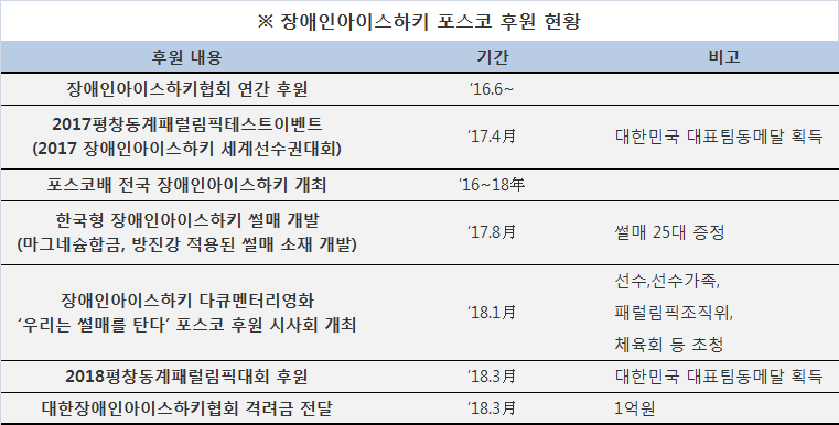 한편 포스코는 장애인 스포츠에 대한 사회적 관심을 높이기 위해 지난 2016년부터 대한장애이인아이스하키협회와 연간후원 협약을 맺고 포스코배대회를 매년 후원해왔다. 선수들의 경기력 향상을 위해 포스코의 강재를 활용한 한국형 장애인아이스하키 썰매 25대를 개발해 기증하는 등 대회 후원과 더불어기술적 지원도 아끼지 않고 있으며, 지난 3월에는 장애인아이스하키 국가대표 선수단에격려금 1억원을 전달하기도 했다.
