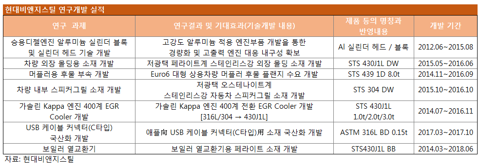 이 밖에도 현대비앤지스틸의 최근 연구개발 실적을 보면 승용 디젤엔진 알루미늄 실린더 블록 및 실린더 헤드 기술 개발, 차량 외장 몰딩용 소재 개발(STS 430J1L DW), 머플러용 후물 부속 개발(STS 439 1D 8.0mm), 차량 내부 스피커 그릴 소재 개발(STS 304 DW), 가솔린 Kappa 엔진 400계 EGR 쿨러(Cooler) 개발(STS 430J1L 1.0/2.0/3.0mm) 등이다.
