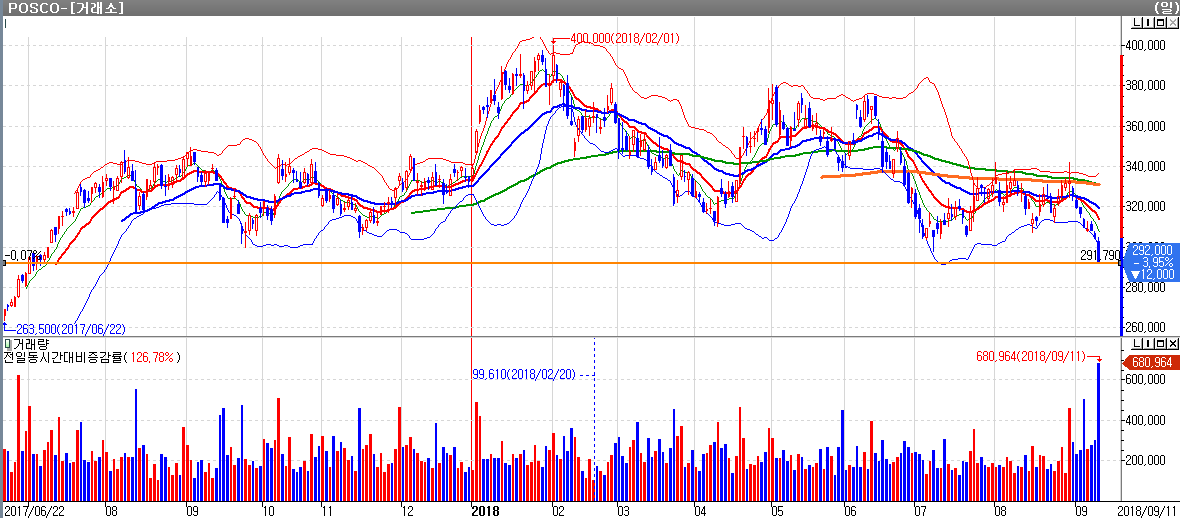 11일 종가 기준 포스코의 주가는 29만2,000원을 기록했다. 성공적인 구조조정과 뚜렷한 실적 개선을 바탕으로 포스코의 주가는 지난해 하반기부터 상승세를 나타냈고 올해 초 40만원까지 올랐다. 그 이후 변동성이 큰 모습을 보이기도 했지만 미국의 무역규제 이슈 및 미중간 무역분쟁 등 대외 악재 등에 따른 우려감 등으로 가격이 하락세를 보이면서 주가가 30만원이 무너졌다.