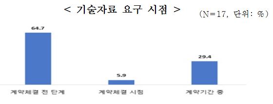 기술자료를 요구받은 시점은 계약체결 전 단계(64.7%)가 가장 많았고, 다음으로 계약 기간 중(29.4%), 계약체결 시점(5.9%) 순서로 조사됐다.