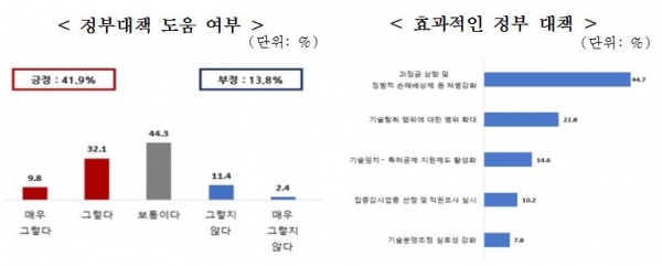 정부 대책이 도움이 된다는 응답(41.9%)이 도움이 되지 않을 것이라는 응답(13.8%)보다 3배가 많았고, 정부가 발표한 대책 중에서 효과가 있을 것으로 기대하는 대책으로는 과징금 상향 및 징벌적 손해배상 등 처벌강화(44.7%), 기술탈취 행위 범위 확대(22.8%), 기술임치·특허공제 지원제도 활성화(14.6%), 집중감시업종 선정 및 직권조사 실시(10.2%)를 꼽았다.
