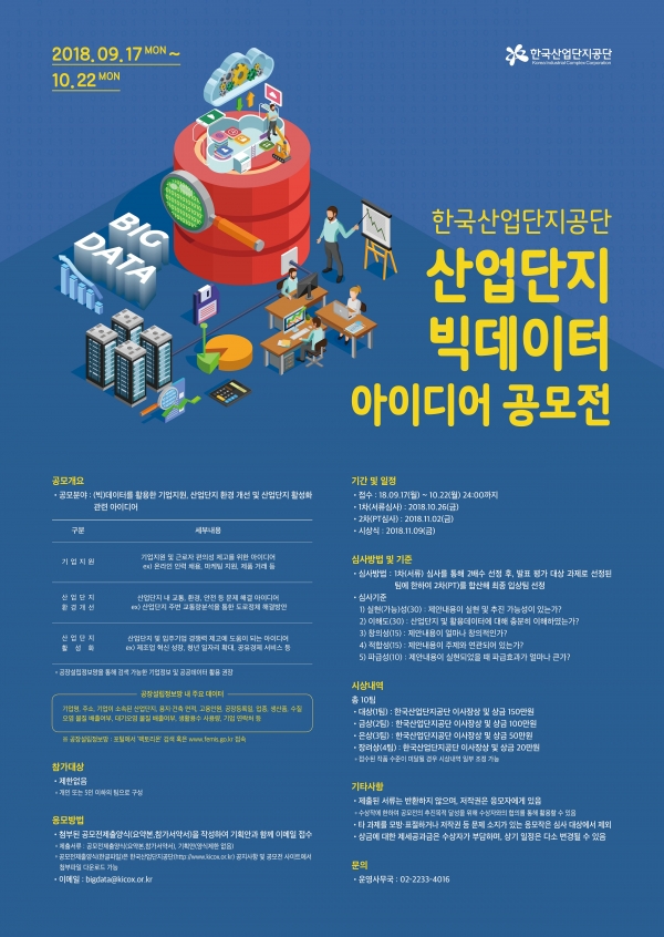 한국산업단지공단(이사장 황규연, 이하 산단공)은 산업단지에 관심이 있는 국민이라면 누구나(개인 또는 팀) 참여할 수 있는 ‘산업단지 빅데이터 아이디어 공모전’을 개최한다.