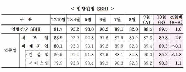 제조업의 10월 경기전망은 전월보다 2.5p 상승한 89.8로 조사되었고, 특별한 경기개선 호재가 없는 비제조업은 0.1p 하락한 89.3으로 전월에 비해 소폭 하락하였다. 한편 건설업은 건설경기 부진전망으로 4.8p 하락한 반면, 서비스업은 1.1p 상승하였다.