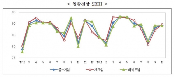 중소기업중앙회(회장 박성택)가 지난 9월 11일부터 9월 18일까지 3,150개 중소기업을 대상으로 ‘2018년 10월 중소기업경기전망조사’를 실시한 결과, 업황전망 중소기업건강도지수(SBHI)가 전월 대비 1.0p 상승하였고 전년 동월 대비 7.8p 상승한 89.5로 조사되어 2개월 연속 반등하였다.