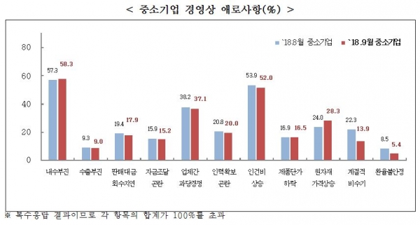 2018년 9월 중소기업의 경영애로(복수응답) 응답을 살펴보면 지난달에 이어 경기침체를 반영하는 ‘내수부진’(58.3%)이 ‘인건비 상승’(52.0%)을 제치고 최다 경영애로사항으로 조사되었다. 이어 ‘업체 간 과당경쟁’(37.1%), ‘원자재 가격상승’(28.3%) 순으로 나타났다. 한편 ‘계절적비수기’는 지난달 22.3%에서 금월 13.9%로 가장 크게 감소했다.